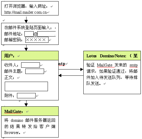 金笛郵件網(wǎng)關(guān)完全基于B/S架構(gòu)的設(shè)計(jì),使得郵件收發(fā)、管理都是基于瀏覽器完成,客戶端只要打開(kāi)IE瀏覽器即可,無(wú)需做任何設(shè)置,大大方便了用戶。也就是說(shuō),在城域網(wǎng)任一節(jié)點(diǎn),都可以通過(guò)內(nèi)部域名(DNS)訪問(wèn)郵件網(wǎng)關(guān),然后通過(guò)郵件網(wǎng)關(guān)與用戶所在的domino郵件服務(wù)器通訊,將郵件主題、郵件內(nèi)容顯示在web頁(yè)面上。金笛?郵件網(wǎng)關(guān)的具體工作流程如下: