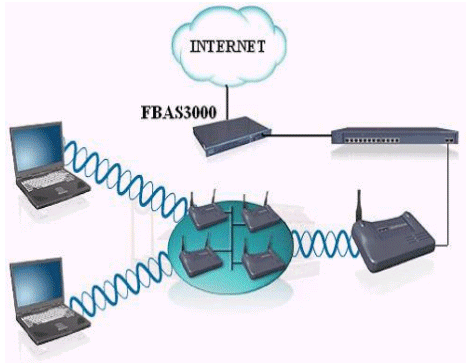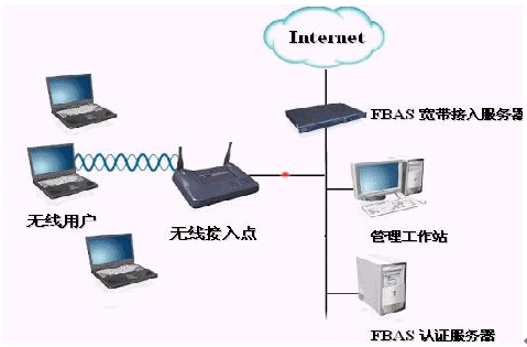 移動(dòng)用戶(hù)通過(guò)自身的無(wú)線(xiàn)網(wǎng)卡傳遞信息到熱點(diǎn)接收器上,熱點(diǎn)接收器連接到交換機(jī)(是為了能具有更好的可拓展性),交換機(jī)連接到華夏科技FutureWorks寬帶計(jì)費(fèi)系統(tǒng)的FBAS接入服務(wù)器上,通過(guò)接入服務(wù)器連接到INTERNET.這里的FBAS3000系列的寬帶接入服務(wù)器采用的是一體機(jī)的模式,接入,認(rèn)證,計(jì)費(fèi)等一系列服務(wù)均安裝在FBAS里,這樣可以簡(jiǎn)化網(wǎng)絡(luò)結(jié)構(gòu)。對(duì)FBAS的操作是通過(guò)WEB頁(yè)面來(lái)進(jìn)行設(shè)置維護(hù)的,