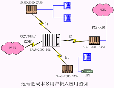 tyutSPAS-2000可編程交換機通過E1可以支持多個遠端模塊。遠端模塊采用SPAS-2000 SAS框,可以帶多種用戶接口:普通模擬用戶、DDN、環(huán)路中繼用戶;通過SPAS-2000 DTS對外提供各種信令接入。適合多點接入組網,組網成本低廉。 在示意圖中,SAS表示遠端用戶接入框,它可以通過需要選擇接入模擬用戶:FXO/FXS、E/M、普通模擬用戶和DDN。中心為SPAS可編程交換機,可以通過 SS7/PRA/R2MF進行匯接轉換。