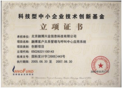 "融博客戶關系管理與呼叫中心應用系統(tǒng)"喜獲國家里科技部2005年中小企業(yè)創(chuàng)新基金的立項,以及中關村科技園區(qū)的創(chuàng)新基金!融博興業(yè)本次立項的產(chǎn)品是2005年北京地區(qū),乃至全國唯一獲得創(chuàng)新基金支持的CRM與呼叫中心應用軟件項目。