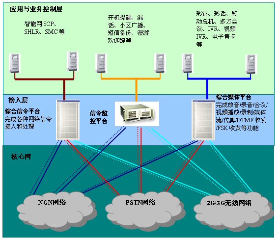東方通信為增值業(yè)務(wù)開發(fā)商提供了全面的接入層解決方案,同一平臺全面提供2G/3G/NGN領(lǐng)域信令、交換、媒體處理功能,系列化產(chǎn)品滿足用戶不同容量的需求。平臺在網(wǎng)絡(luò)中的位置如下圖所示: