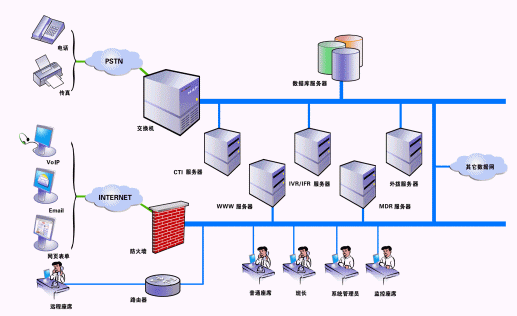 SmartCon呼叫中心由數(shù)字程控交換機(jī)(或中繼板卡)、計(jì)算機(jī)電話集成服務(wù)器(SmartCTI)、交互式語(yǔ)音/傳真應(yīng)答服務(wù)器(SmartIVR/IFR)、多通道數(shù)字錄音服務(wù)器(SmartMDR)、自動(dòng)呼叫分配服務(wù)器(SmartACD)、地理信息系統(tǒng)服務(wù)器(SmartGIS)、Email服務(wù)器、座席終端系統(tǒng)(SmartAgent)、業(yè)務(wù)統(tǒng)計(jì)管理子系統(tǒng)、系統(tǒng)安全管理子系統(tǒng)、數(shù)據(jù)庫(kù)服務(wù)器等組成,其中交換機(jī)又可作為本單位內(nèi)部電話交換機(jī)使用。系統(tǒng)的網(wǎng)絡(luò)結(jié)構(gòu)示意圖如下: