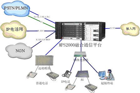 MPS2000融合通信平臺組網(wǎng)能力強(qiáng)大,能夠提供數(shù)字中繼、模擬中繼(包括環(huán)路中繼、二/四線中繼等各種模擬中繼)、IP中繼等硬件接口,在信令協(xié)議上支持NO.7、NO.1、Pri等信令以及H.323、SIP、MGCP等協(xié)議。平臺能夠與數(shù)字網(wǎng)、模擬網(wǎng)、數(shù);旌途W(wǎng)、IP電話網(wǎng)、NGN(下一代網(wǎng)絡(luò))等現(xiàn)有的各種網(wǎng)絡(luò)進(jìn)行組網(wǎng)。