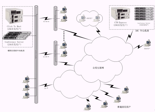 朝陽區(qū)政府的中心機(jī)房里放置多臺FVC公司的Conference Server,實(shí)現(xiàn)支持上千個并發(fā)用戶的超媒體會議支撐處理平臺;在中心機(jī)房放置一套完整的超媒體會議管理系統(tǒng)(Click