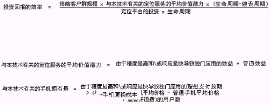 主要的因素有:終端客戶群的規(guī)模、定位平臺(tái)的投資、建設(shè)周期,請(qǐng)看下列公式(未經(jīng)實(shí)際統(tǒng)計(jì)驗(yàn)證,僅僅用于估算):