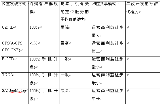 和其他增值服務(wù)一樣,定位服務(wù)的成功在于除了簡(jiǎn)單應(yīng)用外,還有不斷推陳出新的新服務(wù)的支撐,而對(duì)SP和CP應(yīng)用開發(fā)最直接的吸引力依次是:終端客戶群規(guī)模