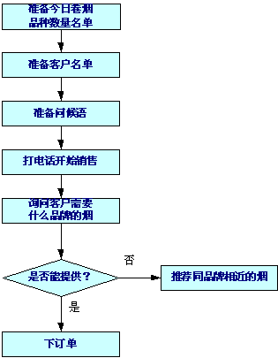 。。我們的訪銷流程是:準備今日卷煙品種數(shù)量名單---準備客戶名單---準備問候語---打電話開始銷售---先問客戶需要什么煙---如能提供的就下訂單。如有不能提供的,向其推薦同品牌相近的煙 。 (請詳見以下流程圖)