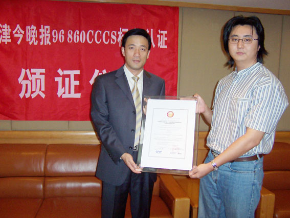 2004年9月9日,天津今晚報(bào)公眾服務(wù)中心通過了《全國呼叫中心運(yùn)營績效標(biāo)準(zhǔn)》(CCCS-OP-2003)認(rèn)證,并獲得由中國信息化推進(jìn)聯(lián)盟客戶關(guān)系管理專業(yè)委員會(huì)頒發(fā)的認(rèn)證證書(四星級客戶服務(wù)中心),成為國內(nèi)傳媒業(yè)首家通過此認(rèn)證的呼叫中心。