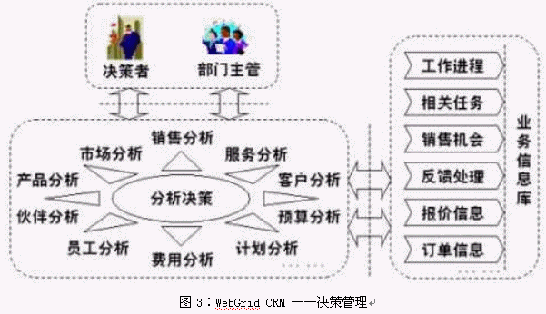 WebGrid CRM是基于CRM理念而設(shè)計(jì)的,它將面向客戶的所有業(yè)務(wù)進(jìn)行整合,提供了統(tǒng)一的業(yè)務(wù)平臺,并使用工作流技術(shù)將各種業(yè)務(wù)緊密聯(lián)系起來。WebGrid CRM 的功能可以歸納為三個方面:1) 對銷售、營銷和客戶服務(wù)三部分業(yè)務(wù)流程的信息化;2) 與客戶進(jìn)行溝通所需要的手段(如電話、傳真、網(wǎng)絡(luò)、Email等)的集成和自動化處理;3) 對上面兩部分功能所積累下的信息進(jìn)行的加工處理,產(chǎn)生客戶智能,為企業(yè)的戰(zhàn)略戰(zhàn)術(shù)的決策作支持。見下圖所示: