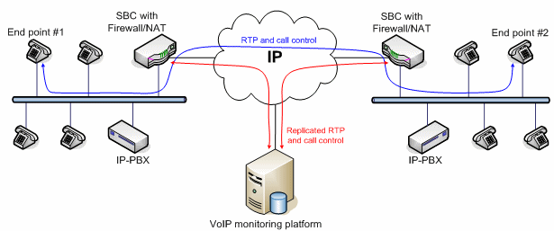 VoIP應(yīng)用的質(zhì)量監(jiān)控分為主動(dòng)式和被動(dòng)式兩種實(shí)現(xiàn)方式。主動(dòng)式的系統(tǒng)能產(chǎn)生呼叫,而被動(dòng)式的系統(tǒng)只是監(jiān)測(cè)進(jìn)行中的呼叫。兩種方法各有優(yōu)勢(shì)。VoIP監(jiān)控方案的架構(gòu)取決于網(wǎng)絡(luò)Edge設(shè)備的類型和結(jié)構(gòu)。有些大型企業(yè)采用的VoIP網(wǎng)絡(luò)配備了一種特殊設(shè)備,叫SBC(Session boarder controller),除了完成類似路由器的功能外,還能完成流量分配、數(shù)據(jù)/語音信號(hào)加密以及業(yè)務(wù)質(zhì)量控制等功能。此外,通過過濾和替換數(shù)據(jù)包內(nèi)的、與用戶有關(guān)的特定信息,SBC還能隱藏公司的網(wǎng)絡(luò)拓?fù)浣Y(jié)構(gòu)和用戶信息,不被外部的IP世界所知道。