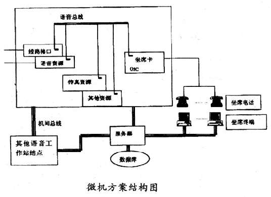 這種方案以近幾年發(fā)展迅速的微機(jī)語音處理技術(shù)為基礎(chǔ),其基本思想是在微機(jī)平臺(tái)上集成各種功能的語音處理卡,完成通信接口、語音處理、傳真處理、坐席轉(zhuǎn)接等功能,再結(jié)合外部的計(jì)算機(jī)網(wǎng)絡(luò)實(shí)現(xiàn)各種應(yīng)用系統(tǒng)的需求。