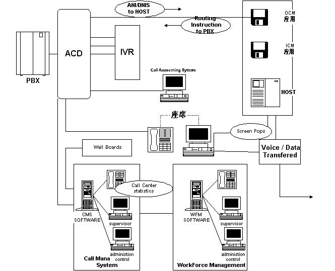 PSTN中繼線路經(jīng)由PBX路由轉(zhuǎn)接到呼叫中心中的個(gè)人電話或其它電話設(shè)備上,即常說的交換機(jī)(switch)。領(lǐng)先的交換機(jī)制造商,象朗訊(Lucent)、北電(Nortel)、Aspect和Rockwell,等等,都提供智能化的交換機(jī)硬件,其中最重要的是自動(dòng)呼叫分配功能,自動(dòng)呼叫分配器(ACD)是一種特殊的交換機(jī)(排隊(duì)機(jī)),用來處理大量密集的話務(wù)并根據(jù)技能優(yōu)先算法和空閑優(yōu)先算法將呼叫智能地轉(zhuǎn)接到合適的座席話務(wù)員。