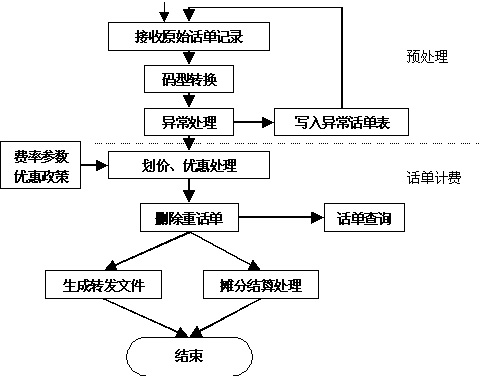 區(qū)域計費中心從交換機實時/定時采集原始話單數(shù)據(jù),它是整個系統(tǒng)的起始點,也是系統(tǒng)其它部分的基礎(chǔ)。其性能直接影響整個系統(tǒng)的運行效果。對該模塊要求穩(wěn)定可靠、處理靈活。 “八國九制”意味著,一個好的計費采集系統(tǒng),必然要求它能夠處理多種交換機格式。比如EWSD、S1240、5ESS等等。 在采集所用網(wǎng)絡(luò)傳輸協(xié)議上,一般要求系統(tǒng)支持X.25/FTAM、X.25/CMIP等協(xié)議。 2.計費結(jié)算 采集機從交換機上采集下來原始話單文件,該類文件是BCD碼文件,需要進行碼型轉(zhuǎn)換,變成ASCII碼文件,為后續(xù)的計費處理創(chuàng)造條件。 話單格式轉(zhuǎn)換:話單格式轉(zhuǎn)換從交換機下載的二進制信息中提取用于計費和統(tǒng)計的信息,并從二進制格式轉(zhuǎn)換為文本格式。但是由于上面提到的原因,國內(nèi)交換機種類比較多,各種交換機的數(shù)據(jù)格式都不相同,即使是相同的交換機,由于需要版本升級,也會對數(shù)據(jù)格式產(chǎn)生影響。假如預(yù)處理模塊不能靈活地處理各種格式的文件,則勢必會對電信服務(wù)商的投資造成浪費。國創(chuàng)公司在話單預(yù)處理中,提供了一種“自定義話單格式”方式,用戶可以根據(jù)自己交換機的數(shù)據(jù)格式進行配置,而預(yù)處理模塊不需進行修改。即可以適應(yīng)當(dāng)前多種交換機并存的局面,又可以適應(yīng)未來交換機版本升級的需求,極大地保護了用戶的投資。 計費劃價處理: 計費計算模塊根據(jù)話單中記錄的起始時間、通話時長、對端號碼等信息在資費策略庫中查找滿足條件的費率極其優(yōu)惠策略。從而計算出此次通話應(yīng)向用戶收取的基本費用。特別地,考慮到業(yè)務(wù)的發(fā)展與變化,系統(tǒng)可對費用中的各項子費用單獨計算,并能夠適應(yīng)新的優(yōu)惠策略的增加。整個計費流程如下: