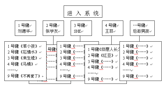 眾所周知,目前大多數(shù)電話機(jī)和手機(jī)的操作鍵盤(pán)都只有0-9十個(gè)數(shù)字鍵和*號(hào)和#號(hào)兩個(gè)符號(hào)鍵,因此在設(shè)計(jì)導(dǎo)航菜單的時(shí)候很受限制。比如在點(diǎn)歌節(jié)目中,用這些數(shù)字鍵來(lái)指代上千首歌曲是根本不可能的。以前多采用的方法有兩種:一是預(yù)先給用戶發(fā)送歌曲手冊(cè),上面可以查到每首歌曲的代號(hào)。這種方式的缺點(diǎn)是實(shí)時(shí)性差,不能隨時(shí)更新歌曲庫(kù)。另外印刷宣傳資料帶來(lái)的人力和成本也不容忽視;另一種方法是將歌曲根據(jù)歌手、主題進(jìn)行分類,比如下圖所列的結(jié)構(gòu):