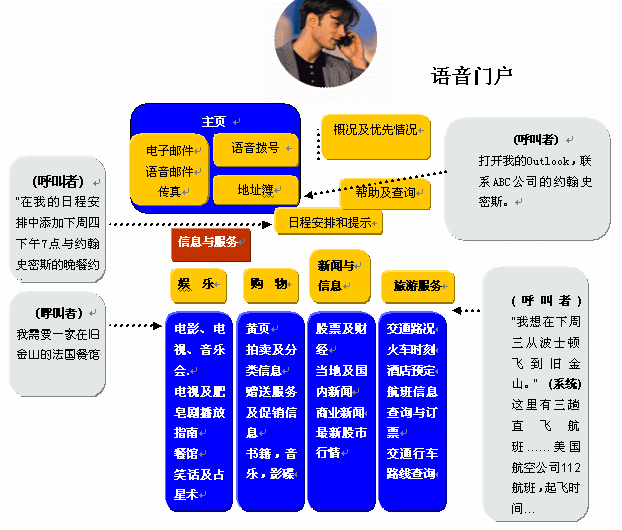 基于在語(yǔ)音識(shí)別技術(shù)準(zhǔn)確度上已有突破性的進(jìn)展,因此可以利用語(yǔ)音,不僅僅是改變?cè)械逆I盤(pán)輸入查詢方式,而且能夠使自動(dòng)應(yīng)答系統(tǒng)處理更加復(fù)雜的情況。用戶撥打服務(wù)電話的時(shí)候,只需說(shuō)出他/她的需求即可。如在電子黃頁(yè)業(yè)務(wù)中,用戶要查詢關(guān)于A公司的情況,服務(wù)電話接通以后就可以直接說(shuō)出"A公司",而不要按鍵通過(guò)一層層的菜單目錄,然后系統(tǒng)就能自動(dòng)播報(bào)出該單位介紹信息和聯(lián)系方式等。