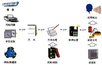-----按照人類言語功能的不同層次,語言合成也可分成三個層次,它們是:(1)從文字到語音的合成(Text-To-Speech);(2)從概念到語音的合成(Concept-To-Speech);(3)從意向到語音的合成(Intention-To-Speech)。這三個層次反映了人類大腦中形成說話內容的不同過程,涉及人類大腦的高級神經活動。不難想象,即使是按規(guī)則的文字到語音合成(文語合成)也已經是相當困難的任務。為了合成出高質量的語言,除了依賴于各種規(guī)則,包括語義學規(guī)則、詞匯規(guī)則、語音學規(guī)則外,還必須對文字的內容有很好的理解,這將涉及自然語言理解的問題。從這一點講,文語轉換系統(tǒng)實際上也可看作一個人工智能系統(tǒng)。圖1顯示了一個完整的文語轉換系統(tǒng)示意圖。文語轉換過程是先將文字序列轉換成音韻序列,再由語音合成器生成語音波形。其中第一步涉及語言學處理,例如分詞、字音轉換等,以及一整套有效的韻律控制規(guī)則;第二步需要先進的語音合成技術,能按要求實時合成出高質量的語音流。因此一般說來,文語合成系統(tǒng)都需要一套復雜的文字序列到音素序列的轉換程序,也就是說,文語轉換系統(tǒng)不僅要應用數字信號處理技術,而且必須有大量的語言學知識的支持。當然其中語音合成終究還是最基本的部分,它相當于“人工嘴巴”,任何語言合成系統(tǒng)包括文語轉換系統(tǒng),都離不開語音合成器。