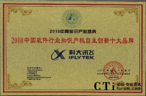 CTI論壇(ctiforum)4月29日消息(記者 潘婷婷):2010年4月25日,由中國知識(shí)產(chǎn)權(quán)研究會(huì)、中國專利保護(hù)協(xié)會(huì)、中國版權(quán)協(xié)會(huì)等單位聯(lián)合舉辦的“2010中外企業(yè)知識(shí)產(chǎn)權(quán)大會(huì)”在人民大會(huì)堂隆重舉行。在當(dāng)日的“2010中國知識(shí)產(chǎn)權(quán)盛典頒獎(jiǎng)典禮”中,科大訊飛憑借強(qiáng)大的自主創(chuàng)新能力以及在知識(shí)產(chǎn)權(quán)創(chuàng)造、保護(hù)與應(yīng)用方面的突出表現(xiàn)獲評(píng)“2010年中國軟件行業(yè)知識(shí)產(chǎn)權(quán)自主創(chuàng)新十大品牌”。