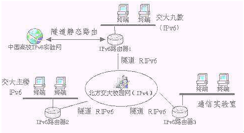 FH6501(IPv6路由器)已經(jīng)在北方交通大學學生IPv6實驗床實際安全運行了六個月。北方交通大學學生IPv6實驗床采用我公司IPv6路由器產(chǎn)品,架構(gòu)了三個主節(jié)點,借助隧道連接到由Nokia資助建設的中國高校IPv6實驗床。目前三個主節(jié)點之間的連接是借助于學校原有的IPv4網(wǎng)絡,通過隧道技術(shù)實現(xiàn)節(jié)點間的通信(見圖示)。