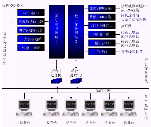 佳訊公司推出的飛鴻9000系列產品是新一代全新智能長途人工話務系統(tǒng),由"后臺交換系統(tǒng)"與"前臺座席系統(tǒng)"兩部分組成。"后臺交換系統(tǒng)"基于數字程控交換的原理設計,運用先進的數字化技術,提供豐富的數字和模擬接口,方便的與現有設備連接。標準E1數字中繼可直接與本地程控交換機相連,省去了PMUX設備,一改過去模擬系統(tǒng)同數字程控交換設備接口困難,轉換設備復雜的缺點。各類豐富的模擬接口(載波接口、PCM四線接口、共電接口、磁石接口、環(huán)路中繼接口、養(yǎng)路接口、VF接口等)可方便的接入各種模擬設備。