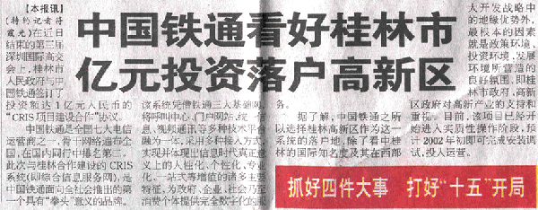 在此項(xiàng)目合作中,桂林市政府借助鐵通在電信市場(chǎng)上的綜合服務(wù)優(yōu)勢(shì)及佳訊飛鴻公司豐富的CALL CENTER系統(tǒng)集成經(jīng)驗(yàn),以高起點(diǎn)、大規(guī)劃的指導(dǎo)思想,建立以綜合信息服務(wù)、電子政務(wù)、企業(yè)客戶服務(wù)、旅游服務(wù)、電子教育服務(wù)和電子商務(wù)服務(wù)為核心的城市信息化交互平臺(tái)。根據(jù)該協(xié)議,鐵通網(wǎng)絡(luò)公司將投資1億元人民幣分階段建設(shè)桂林城市信息化標(biāo)志性工程CRIS,一期投資建設(shè)100個(gè)座席。建成后的CRIS系統(tǒng)平臺(tái),幫助桂林市對(duì)現(xiàn)有的各信息網(wǎng)數(shù)據(jù)加以全面整合、優(yōu)化,真正實(shí)現(xiàn)“多網(wǎng)合一”和信息的智能化、人性化。為旅游業(yè)、信息產(chǎn)業(yè)、高新產(chǎn)業(yè)、會(huì)展經(jīng)濟(jì)、招商引資和政府信息化等各個(gè)方面,提供最佳的、全方位的、高品質(zhì)的綜合信息服務(wù),全面帶動(dòng)桂林市的經(jīng)濟(jì)發(fā)展。