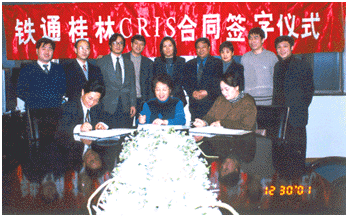 桂林CRIS項目經(jīng)過多方面的努力,2001年12月30日在中鐵網(wǎng)絡(luò)公司,舉行了由中鐵網(wǎng)絡(luò)公司、北京佳訊飛鴻信息技術(shù)有限公司和桂林訊聯(lián)科技有限公司三方代表參加的鐵通桂林CRIS項目合同簽約儀式。