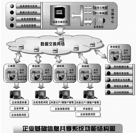 (1) 通過企業(yè)基礎(chǔ)信息交換與共享系統(tǒng)將不同的政府部門辦公網(wǎng)絡(luò)連接在一起,形成資源共享,消除孤島現(xiàn)象;