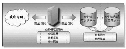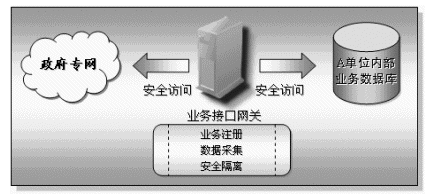 為了實現(xiàn)企業(yè)基礎(chǔ)信息交換與共享,各個接入平臺的單位必須將需要提供給其他單位的企業(yè)數(shù)據(jù)共享出來,基于安全、保密等多種因素考慮,這些單位的業(yè)務(wù)數(shù)據(jù)庫不可以也不應(yīng)該對其他單位完全開放(也就是直接連在政府專網(wǎng)上),而業(yè)務(wù)接口網(wǎng)關(guān)的作用就是將業(yè)務(wù)數(shù)據(jù)庫與政府專網(wǎng)之間的隔離、實現(xiàn)業(yè)務(wù)注冊以及數(shù)據(jù)采集等功能。業(yè)務(wù)接口網(wǎng)關(guān)的兩個網(wǎng)絡(luò)端口分別連接業(yè)務(wù)數(shù)據(jù)庫以及政府專網(wǎng),機(jī)關(guān)單位將它們業(yè)務(wù)數(shù)據(jù)庫中需要共享的業(yè)務(wù)數(shù)據(jù)項名稱注冊到信息中心的業(yè)務(wù)注冊庫中,其他機(jī)關(guān)單位通過查詢業(yè)務(wù)注冊庫獲取對方單位的業(yè)務(wù)注冊信息,并通過自己的業(yè)務(wù)接口網(wǎng)關(guān)向信息交換機(jī)發(fā)出業(yè)務(wù)數(shù)據(jù)采集的要求,信息交換機(jī)接收請求后對請求進(jìn)行校驗,校驗通過后信息交換機(jī)會通過被采集業(yè)務(wù)數(shù)據(jù)庫所在單位的業(yè)務(wù)接口網(wǎng)關(guān)獲取業(yè)務(wù)數(shù)據(jù),數(shù)據(jù)通過信息交換機(jī)交換到采集單位的業(yè)務(wù)接口網(wǎng)關(guān),此時采集單位可以將數(shù)據(jù)保存在己方的采集數(shù)據(jù)庫中,或者直接由應(yīng)用系統(tǒng)使用。