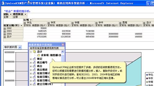 可以利用SynleadCRM企業(yè)版提供的在線聯(lián)機(jī)分析工具實(shí)現(xiàn),也可以導(dǎo)出到EXCEL中,利用EXCEL的有關(guān)功能實(shí)現(xiàn)。OLAP在線聯(lián)機(jī)分析,屬于商業(yè)智能BI的組成部分之一,它允許您對數(shù)據(jù)進(jìn)行任意的上鉆、下鉆,旋轉(zhuǎn)、切片、切塊,得到更豐富的、更有價值的圖表和報(bào)表。