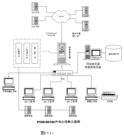 系統(tǒng)主要由計(jì)算機(jī)網(wǎng)絡(luò)、數(shù)字中繼接口、人工座席、語(yǔ)音處理及存儲(chǔ)、系統(tǒng)管理(數(shù)據(jù)庫(kù)管理+計(jì)費(fèi)管理+語(yǔ)音編輯)幾部分組成。如圖2·1所示: