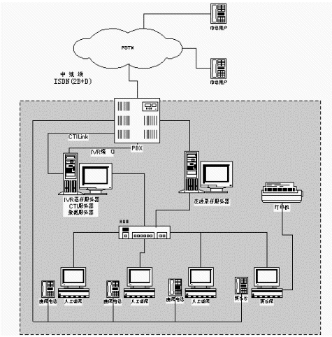 一臺(tái)Siemens Hipath交換機(jī):接入16條(2B+D)ISDN中繼線,設(shè)置人工座席分機(jī),為CTI、IVR語(yǔ)音服務(wù)器提供8路IVR端口。
