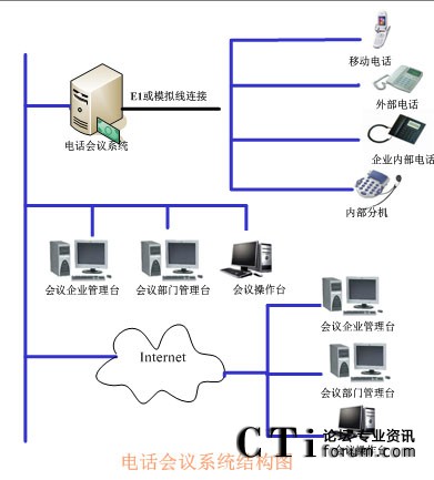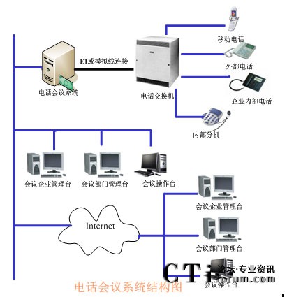 TalenTel CNF 電話(huà)會(huì)議系統(tǒng)需要與企業(yè)的PBX連接,如果沒(méi)有企業(yè)內(nèi)部程控交換機(jī)則可以將中繼線(xiàn)直接接在會(huì)議系統(tǒng)主機(jī)上,中繼線(xiàn)可以是普通模擬中繼,也可以是E1接口(如中國(guó)一號(hào)信令、30B+D等)。在與會(huì)議系統(tǒng)主機(jī)的同一網(wǎng)段上可以配置多個(gè)會(huì)議客戶(hù)端系統(tǒng),通過(guò)客戶(hù)端系統(tǒng)用戶(hù)可以隨時(shí)觀(guān)察和監(jiān)視會(huì)議系統(tǒng)的使用情況,并且可以建立常用用戶(hù)的用戶(hù)資料,也可以對(duì)常用用戶(hù)進(jìn)行分組,這樣要呼叫某些用戶(hù)開(kāi)會(huì)時(shí)只需呼叫組用戶(hù)即可。