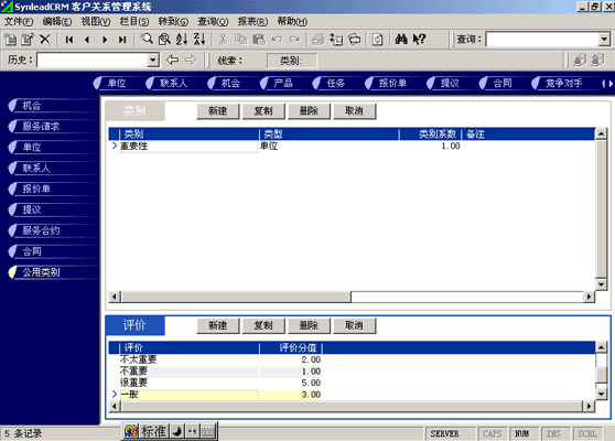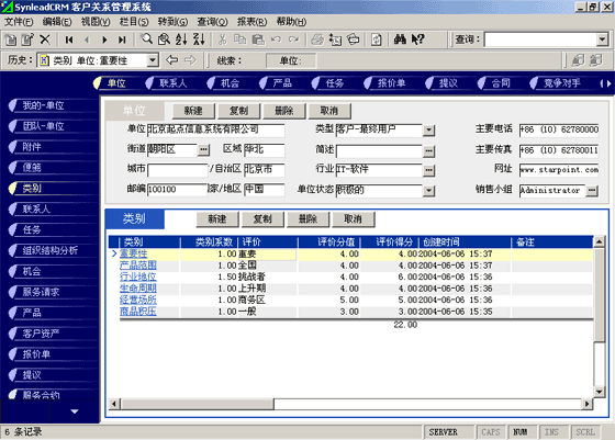 客戶單位的分類較聯(lián)系人的分類更復(fù)雜。常用的分類有:按照企業(yè)規(guī)模來(lái)分類(大、中、小,層次自定義,下同)、按照該客戶與本單位的緊密程度分類(緊密、普通、疏遠(yuǎn))、按照該客戶的重要性分類(重要、普通、次要)、按照該客戶的忠誠(chéng)度分類(忠誠(chéng)、普通、游移)。有一些用戶企業(yè),希望對(duì)客戶單位特征進(jìn)行采集,進(jìn)而進(jìn)行客戶信用評(píng)價(jià)。信用特征的類別可以多達(dá)數(shù)十種類(詳細(xì)情況可參考有關(guān)書(shū)籍)。利用SynleadCRM,您可以為每個(gè)類指定系數(shù),為類下屬的每個(gè)評(píng)價(jià)指定評(píng)分分值。例如,您可以建立一個(gè)類別為"客戶倉(cāng)庫(kù)積壓商品的情況",系數(shù)為1,該類別下屬的評(píng)價(jià)有"很多1分"、"一般3分"、"少1分"、"未知0分",如果指定某客戶該類別的評(píng)價(jià)為一般,則該項(xiàng)目得分為3分*1(系數(shù))=3分。依此類推,您還可以指定更多的分類與評(píng)價(jià),例如:客戶經(jīng)營(yíng)場(chǎng)所所處的位置、客戶在企業(yè)生命周期中所處的位置、客戶在行業(yè)中的地位、客戶產(chǎn)品的組合情況、客戶產(chǎn)品覆蓋的市場(chǎng)范圍、客戶產(chǎn)品的淡旺季規(guī)律、客戶近年?duì)I業(yè)額的增減趨勢(shì)、客戶的年度營(yíng)業(yè)額、客戶的現(xiàn)金周轉(zhuǎn)能力、客戶的負(fù)債情況、客戶是否涉及中大訴訟等。每一個(gè)類別項(xiàng)目的評(píng)分經(jīng)過(guò)系數(shù)的加權(quán)運(yùn)算后,可以求和,得到這個(gè)客戶的總評(píng)分。未來(lái)也可以利用分析模型對(duì)此類數(shù)據(jù)進(jìn)行進(jìn)一步的分析,提供輔助決策所需要的圖表和報(bào)表。