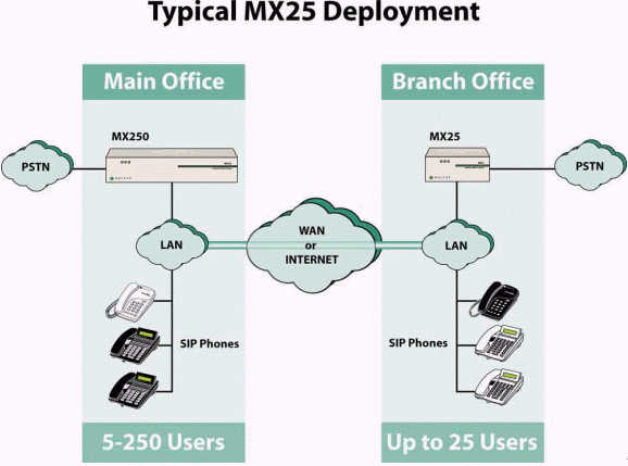 當(dāng)與MX250一起使用時(shí), MX25提供了一種既能將MX250的功能擴(kuò)展至分支機(jī)構(gòu),同時(shí)又可確保該分支機(jī)構(gòu)與PSTN有效連接的低成本的解決方案。遠(yuǎn)程機(jī)構(gòu)的工作人員同樣可以使用語音信箱、自動(dòng)話務(wù)員、在線狀態(tài)和即時(shí)消息等功能。如同在總部工作一樣這些遠(yuǎn)程機(jī)構(gòu)的工作人員可以與企業(yè)內(nèi)部任意其它地點(diǎn)的人員進(jìn)行溝通,也可以擔(dān)當(dāng)接線員或ACD(自動(dòng)話務(wù)分配)組成員的工作。