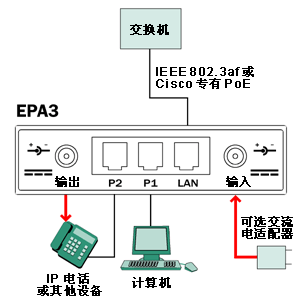 EPA3 與 IEEE 802.3af 標(biāo)準(zhǔn)以太網(wǎng)供電 (PoE) 以及 Cisco 專(zhuān)有的嵌入式電源兼容。EPA3 采用 PoE 作為輸入,并將它轉(zhuǎn)換為直流輸出到帶電源插座的電纜上。使用