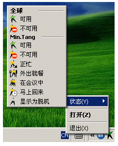 用戶可以點(diǎn)擊“設(shè)置狀態(tài)”工具欄的上圖標(biāo)或是點(diǎn)擊右下角“系統(tǒng)托盤(pán)”中的圖標(biāo)來(lái)設(shè)置自己的工作狀態(tài)。