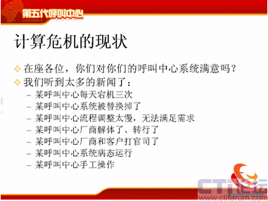 呼叫中心現(xiàn)在已經(jīng)了比較嚴(yán)重的計(jì)算危機(jī),我聽到了很多,因?yàn)槲抑攸c(diǎn)是在搞技術(shù)這一行當(dāng),我就問一個(gè)問題,在座的各位,你們對(duì)你們的呼叫系統(tǒng)滿意嗎?我相信大部分人可能嘴上都說比較滿意,但是很多人對(duì)深層次的矛盾都非常清楚,為什么不滿意?