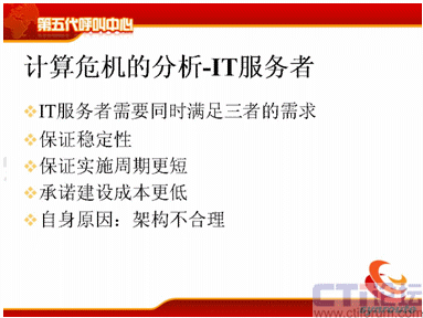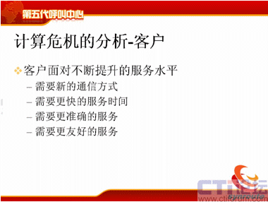 我分析一下計(jì)算的危機(jī),計(jì)算危機(jī)來源于三個(gè)方面,第一是客戶面對(duì)不斷提升的服務(wù)水平,現(xiàn)在需要新的通信方式,包括電話、傳真、短信、電子郵件等等,還包括網(wǎng)上的護(hù)航瀏覽,表單共享,電子排版等等通信方式。第二方面需要更快的服務(wù)時(shí)間,80%的電話是20秒接起,可是短信的響應(yīng)時(shí)間為什么這么長(zhǎng),需要更準(zhǔn)確的服務(wù),電話的服務(wù)是什么樣的,我現(xiàn)在需要網(wǎng)上交談的服務(wù)質(zhì)量也能夠得到保障等等,這是客戶對(duì)IT服務(wù)者提供的壓力。