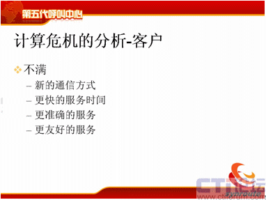 現(xiàn)在我們就分析一下后果,這時(shí)候計(jì)算危機(jī)的分析對(duì)于客戶來說,新的通訊方式我們都需要,可是呼叫中心沒有公布,我無法使用,更快的服務(wù)時(shí)間,大家看到了,比如說Web Chat,目前我點(diǎn)擊了80%是直接進(jìn)入留言的頁(yè)面,也就是說這時(shí)候沒有人工來服務(wù)了,或者是等待時(shí)間非常非常長(zhǎng),一個(gè)小時(shí)以后告訴我,排隊(duì)已經(jīng)到了,已經(jīng)沒有人能為我服務(wù)的,服務(wù)時(shí)間是根本沒有辦法保證的。第三個(gè)方面我們要更準(zhǔn)確的服務(wù),電話打進(jìn)去以后告訴我的信息和網(wǎng)絡(luò)告訴我的信息是完全不一樣的呢?為什么呢?因?yàn)樗闹R(shí)庫(kù)沒有關(guān)聯(lián)起來,業(yè)務(wù)流程沒有關(guān)聯(lián)起來,這種更友好的服務(wù),考核的指標(biāo)都是一樣的。