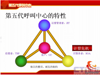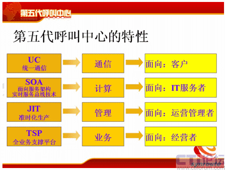 從分代上來講,和何總說的稍微有點(diǎn)差異,但是基本上一樣的,第一代是人工熱線的電話系統(tǒng),時(shí)間點(diǎn)也差不多;第二代是有了座席IVR、自動(dòng)語音應(yīng)答這個(gè)特點(diǎn);第三代是有了CTI、ACD企業(yè)級(jí)的呼叫中心;第四代是互聯(lián)網(wǎng),有VOIP、多媒體等等這些多媒體的呼叫中心。那么第五代是什么?第五代的典型特征是融合共享,它是有四個(gè)特性,UC、SOA、JIT和TSP,這是五代的幾個(gè)主要特點(diǎn)。