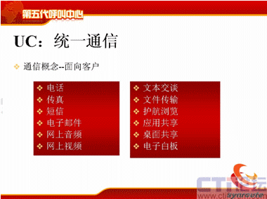 那么這幾個(gè)特點(diǎn)稍微簡(jiǎn)單地說一下,可能大家了解比較多了,從UC上來講,不管是現(xiàn)在國(guó)際上比較領(lǐng)先的通信廠商,CISCO、華為都在提UC的概念,軟件行業(yè)包括微軟。UC包括了通信的渠道,包括電話、傳真、短信、電子郵件、網(wǎng)上音頻、視頻,文本交談,文件傳輸、護(hù)航瀏覽、應(yīng)用共享、桌面共享等等,這是統(tǒng)一通信的部分。
