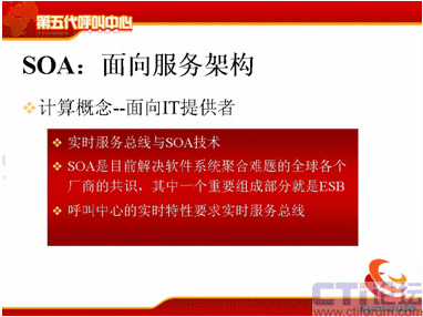 SOA就是面向服務(wù)的架構(gòu),這個(gè)概念近兩、三年來在中國(guó)的發(fā)展是比較快的,計(jì)算的概念,它是面向IT提供者。實(shí)時(shí)服務(wù)總線技術(shù)與SOA,SOA是目前解決軟件系統(tǒng)聚合難題的全球各個(gè)廠商的共識(shí),其中一個(gè)重要的概念是ESB,不知道大家清楚嗎?就是企業(yè)服務(wù)總線,是SOA里面重要的組成部分,呼叫中心的實(shí)時(shí)特性要求,這個(gè)服務(wù)總線不是普通的服務(wù)總線,而是實(shí)時(shí)的服務(wù)總線。