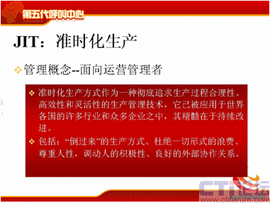 這四個(gè)特性是相輔相成的,首先在獨(dú)立方面,每一部分都有自己的特點(diǎn),適應(yīng)自己企業(yè)發(fā)展的需要,同時(shí)也是相互制約的。首先我說這個(gè)獨(dú)立意識(shí),對(duì)于呼叫中心來說,從經(jīng)營(yíng)者的角度上,為什么要提TSP的概念呢?我們經(jīng)常遇到一個(gè)企業(yè)建立呼叫中心,是一個(gè)客戶服務(wù)中心,我們現(xiàn)在要做電話營(yíng)銷了,那好吧,我們就建一套電話營(yíng)銷系統(tǒng);這時(shí)候我們要做網(wǎng)絡(luò)方面的營(yíng)銷,好了,我們?cè)僮鲆粋(gè)網(wǎng)絡(luò)營(yíng)銷的呼叫中心,這是經(jīng)營(yíng)者現(xiàn)在意識(shí)亟待需要提高的。對(duì)于運(yùn)營(yíng)管理者來說,JIT思想,我剛才說過它是一個(gè)核心的,它是一個(gè)不斷需要改進(jìn)流程的,改進(jìn)去優(yōu)化的,提出各種KPI指標(biāo)去優(yōu)化的,那么這個(gè)過程也是現(xiàn)在目前運(yùn)營(yíng)管理者一直比較薄弱的,需要一直提高的部分。