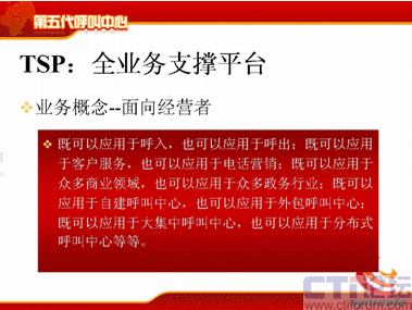 TSP這個(gè)概念其實(shí)比較清晰,比較簡(jiǎn)單,它的意思就說對(duì)于呼叫中心來說,它能支持各種業(yè)務(wù),既可以支持呼入,也可以支持呼出;既可以應(yīng)用于客戶服務(wù),也可以應(yīng)用于電話營(yíng)銷;既可以應(yīng)用于商業(yè)領(lǐng)域,也可以應(yīng)用于政務(wù)領(lǐng)域;既可以用于自建,也可以用于外包;可以是大規(guī)模集中的,也可以是分布式的。