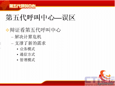 下面我提第五代呼叫中心的誤區(qū),首先我們要辯證地看第五代呼叫中心,剛才好像我在解決問題,這個(gè)呼叫中心的計(jì)算危機(jī)產(chǎn)生了,我在解決計(jì)算危機(jī)的問題,但是大家要反著想,我把這個(gè)問題解決了,我按這種方式去架構(gòu)了,這時(shí)候它的業(yè)務(wù)模式就能支持到非常豐富了,而以前的業(yè)務(wù)模式,業(yè)務(wù)的創(chuàng)造為什么進(jìn)行不下去?我們不能說(shuō)全部都是因?yàn)镮T系統(tǒng),但是IT系統(tǒng)占很大的一個(gè)部分,其實(shí)就是因?yàn)橥顿Y的部分,如果你有足夠錢的話,可以實(shí)現(xiàn)足夠的想法。第二個(gè)方面通信方式也是一樣,通信方式也是你可以支持更多的通信方式,你可以將3G的視頻加上去,你可以將很多業(yè)務(wù)加進(jìn)去,你可以把固定點(diǎn)報(bào)警加上去,你可以把IPTV的業(yè)務(wù)方式加上去,管理模式也一樣,你可以不斷地調(diào)整,這個(gè)調(diào)整只要是在框架一定范圍內(nèi)不斷地調(diào)整都可以支持,那么對(duì)于運(yùn)營(yíng)管理也能同樣進(jìn)行有效的支持。