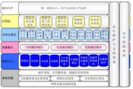 整個系統(tǒng)的底層是信息系統(tǒng)的基礎設施,這包括網絡及通訊設施、主機服務器及存儲系統(tǒng)、視頻會議系統(tǒng)、大屏幕數據演示系統(tǒng),以及操作系統(tǒng)、數據庫管理系統(tǒng)及網絡通訊基礎設施等,這些是系統(tǒng)最基本的運行基礎。