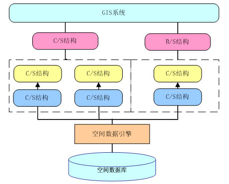 GIS應用劃分成基于C/S結構的應用和基于B/S結構的應用兩種。前一種結構適用于實現(xiàn)數據的采集、入庫、編輯和復雜的空間分析、專題制圖等應用,主要是面向數據維護人員和專業(yè)分析人員使用的,以及為領導和專家提供輔助決策和分析之用;而后一種結構比較適合于實現(xiàn)簡單的地圖發(fā)布、空間查詢等應用,主要面向的是廣大的Internet用戶。由于這兩種結構各有優(yōu)缺點,而從指揮中心的總體角度來看,兩種結構的應用都是不可缺少的。系統(tǒng)的總體結構將是一個同時包含了C/S和B/S兩種結構的混合型、綜合型結構。系統(tǒng)結構如下: