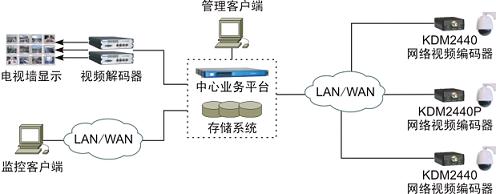 KDM2440/2440P可作為網(wǎng)絡(luò)視頻監(jiān)控系統(tǒng)的智能化前端接入單元,與攝像機(jī)一起實現(xiàn)監(jiān)控點(diǎn)的集成化部署,攝像機(jī)采集的模擬視頻信號經(jīng)編碼處理后以IP碼流形式上傳至中心業(yè)務(wù)平臺,在監(jiān)控客戶端的管理和控制下,中心業(yè)務(wù)平臺將上傳的碼流按需轉(zhuǎn)發(fā)到監(jiān)控客戶端、視頻解碼器以及網(wǎng)絡(luò)錄像單元,分別實現(xiàn)PC瀏覽、電視墻顯示以及錄像存儲。