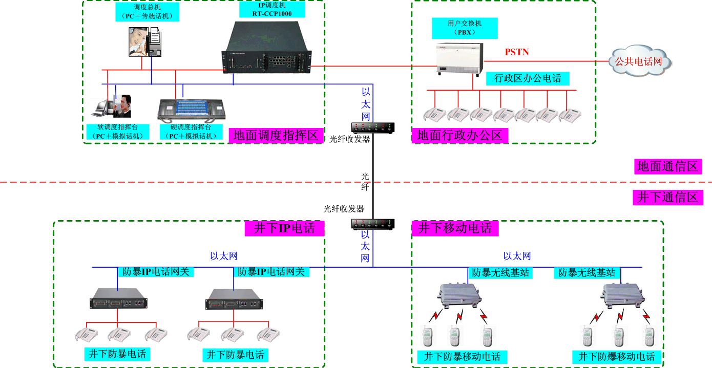 在傳統(tǒng)調度技術基礎上完美的將固話網絡、IP網絡、無線網絡充分融合,可以實現井上調度指揮區(qū)及井上行政辦公區(qū)、井下IP電話及井下移動電話的互通,也能提供接口與原有的行政辦公電話無縫整合。同時也完美的解決了不同網絡之間、多套系統(tǒng)之間存在兼容性差、共享性差、重復投資、操作復雜等諸多缺陷。