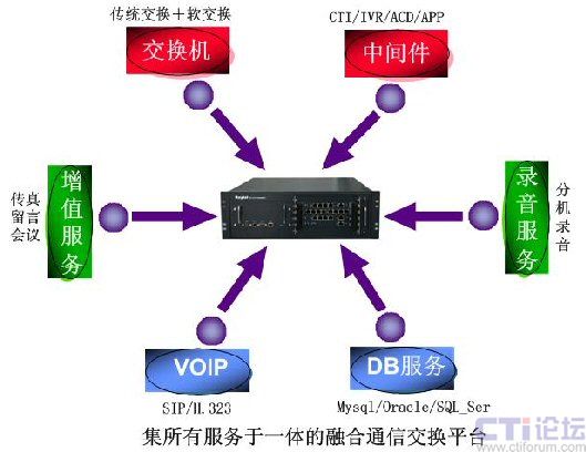 融天科技多媒體呼叫中心采用國際領(lǐng)先技術(shù)的融合通信一體化平臺,該平臺集傳統(tǒng)PBX、IP-PBX于一體,集CTI、IVR、ACD、APP等服務(wù)功能于一體,集錄音、傳真、會議、留言等全套的增值業(yè)務(wù)于一體,硬件平臺非常簡單,用戶只需要購買一臺硬件設(shè)備即可: