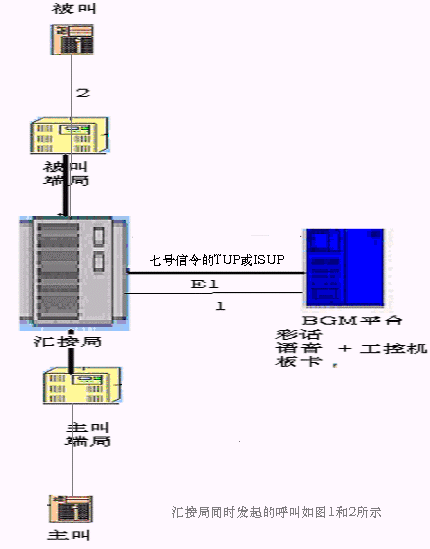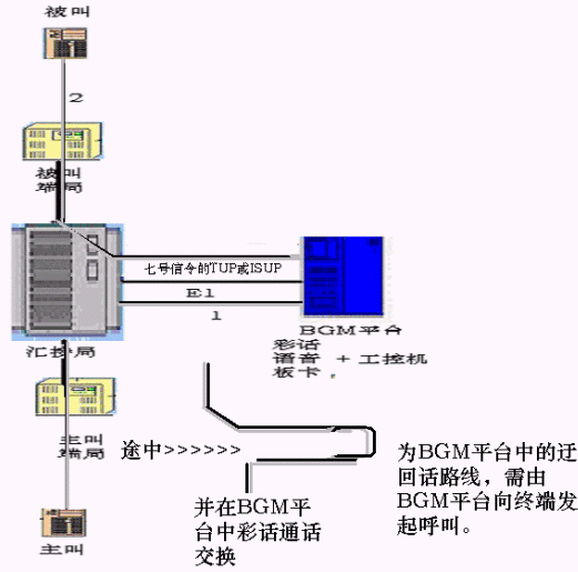 當呼叫進入?yún)R接局交換機并獲取呼叫的主被叫信息后,匯接局交換機對設(shè)置了彩話業(yè)務的用戶作呼叫轉(zhuǎn)移到BGM平臺,并同時通過ISUP信令把主叫、被叫號傳遞給BGM平臺,BGM平臺即時向被叫端局發(fā)起呼叫,當被叫方摘機,BGM平臺控制主叫與被叫接通,并根據(jù)被叫用戶保存的定制的彩話信息和業(yè)務邏輯對主被叫的通話進行相應的背景語音播放操作,該語音僅作為背景音樂,不影響正常的雙方通話。當主被叫任意方掛機時,交換機將IVR單元和被叫的連接斷開,這樣就完成了一個完整的彩話服務。這種方案的技術(shù)優(yōu)勢是任何交換機都可實施,多么古老落后的運營設(shè)備都能實施,缺點是占用BGM平臺較大比例的語音板卡通道,語音板卡硬件的成本增加,因此需要選用高密度的信令語音一體化技術(shù)的語音板卡,可降低成本,并獲取較高的性能價格比。如下結(jié)構(gòu)示意圖: